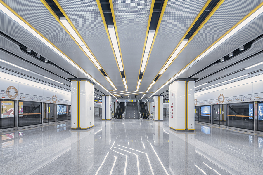 孵化园站延续成都地铁18号线站点特色“科技创新”为设计主题,以“折线”三维元素将空间、灯具、综合末端一体化设计,细节精致设计,创造具有科技未来感,契合“创业天府”文化定位的艺术空间。艺术品结合造型嵌入多媒体艺术装置,增加趣味性和互动性,展现科技无限的遐想,实现艺术空间一体化。
