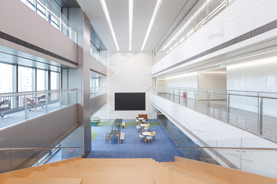 为创造多元的社交协作空间,提供一个休憩、对话和亲近自然的环境,J&A设计团队在建筑中区及高区每隔三层设置一个半开放式的罗马广场,员工可以按自由围合的形式进行分享、讨论,是沟通协作区,也兼作临时办公区。