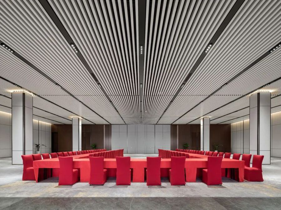 一层的天花在保持整体视觉统一的同时,针对特殊消防需求,采用实体金属板与冲孔金属板结合的方式,实现了美观与实用性的双重目标。