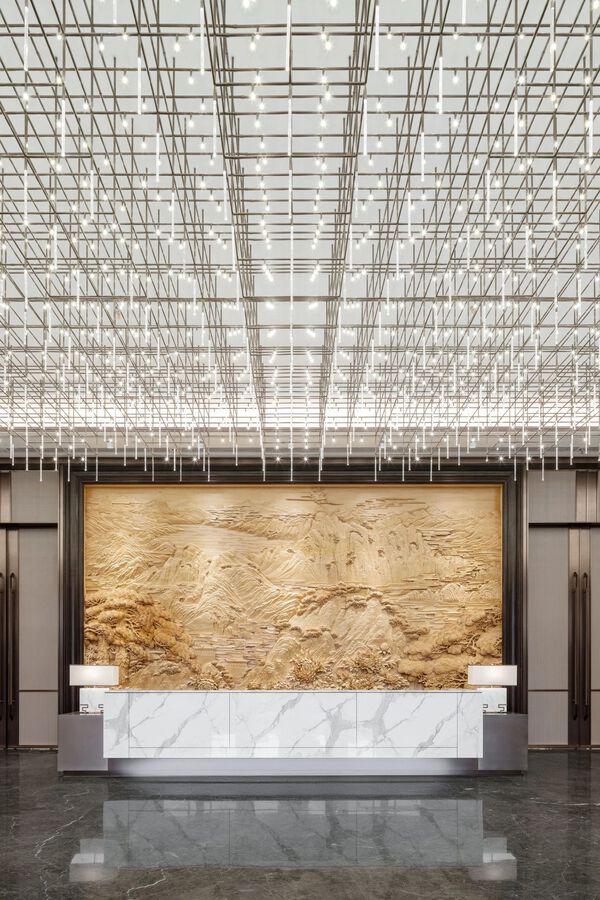 东登录厅柱子与天花的交汇处以金属套口,巧妙地遮掩了格栅的断点;室内软装设以“鹿”为主题的艺术品,扮演着“引路者”的角色,与天花设计相得益彰,为每位踏入空间的访客营造了一份典雅的仪式感。