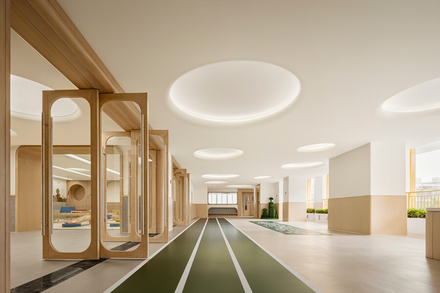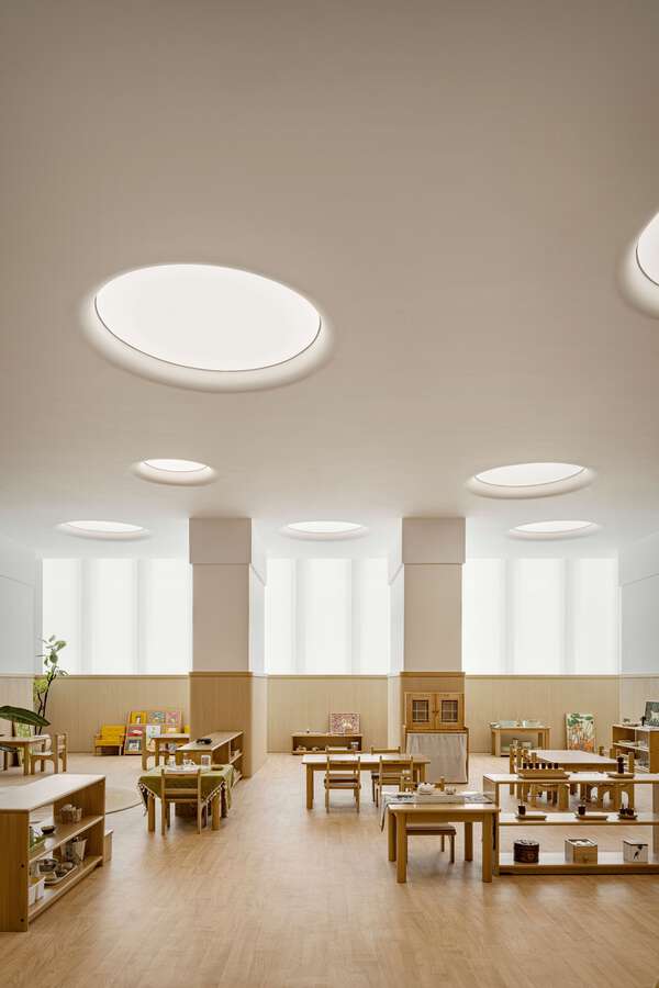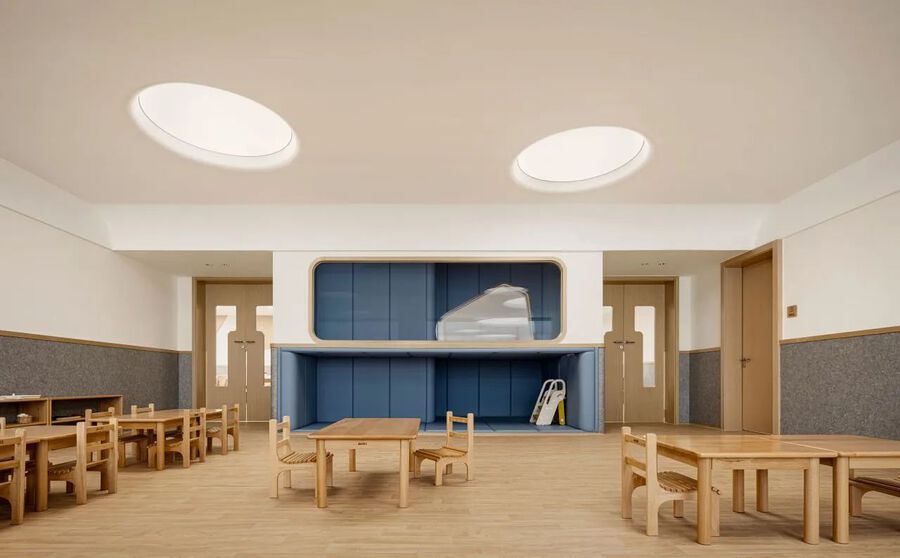 J&A在立面提升及室内设计中引入“天圆地方”的设计理念,通过灵活的空间布局,搭配中国传统色彩元素与贴心设施,为孩子们提供了一个温馨、安全且富有启发性的成长空间。
