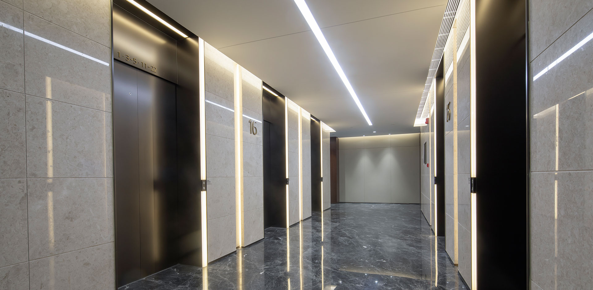 作为一家现代物流服务公司,深圳国际控股有限公司一直致力于物流产业创新、提升社会物流效率。在对企业精神及需求进行全面调研了解之后,J&A杰恩设计在设计中采用现代简约的空间风格,营造出一个大气、稳重的现代化办公空间。首层大堂采用挑高空间,形成视觉上的延伸,电梯厅端景采用水幕墙,水雾濛濛间搭配巧妙的灯饰流光溢彩,给人以心境明朗开阔之感。项目大面积采用落地玻璃,充分利用自然景色进行室内装饰,顶层的落地玻璃将屋顶花园与贵宾接待室一分为二,在自然光线下,为贵宾接待室增添多了一份赏心悦目的景色。