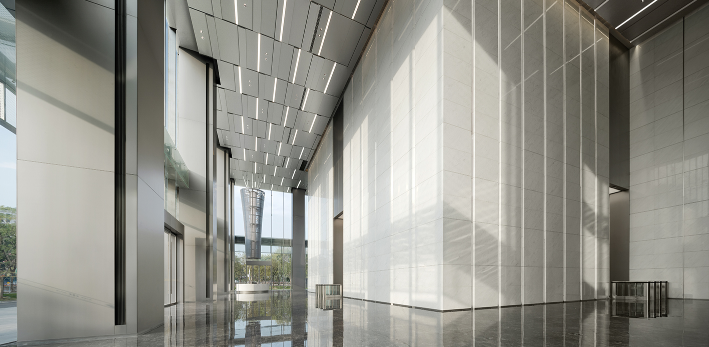 结合建筑“都市叠园”的设计理念以及香蜜湖美丽的风景线作为灵感来源,J&A杰恩设计交织出以“山水与城市相连,自然与文化交融”为大堂核心设计主题,致力于为人们提供在城市中回归自然,重塑人文社区文化的办公方式。